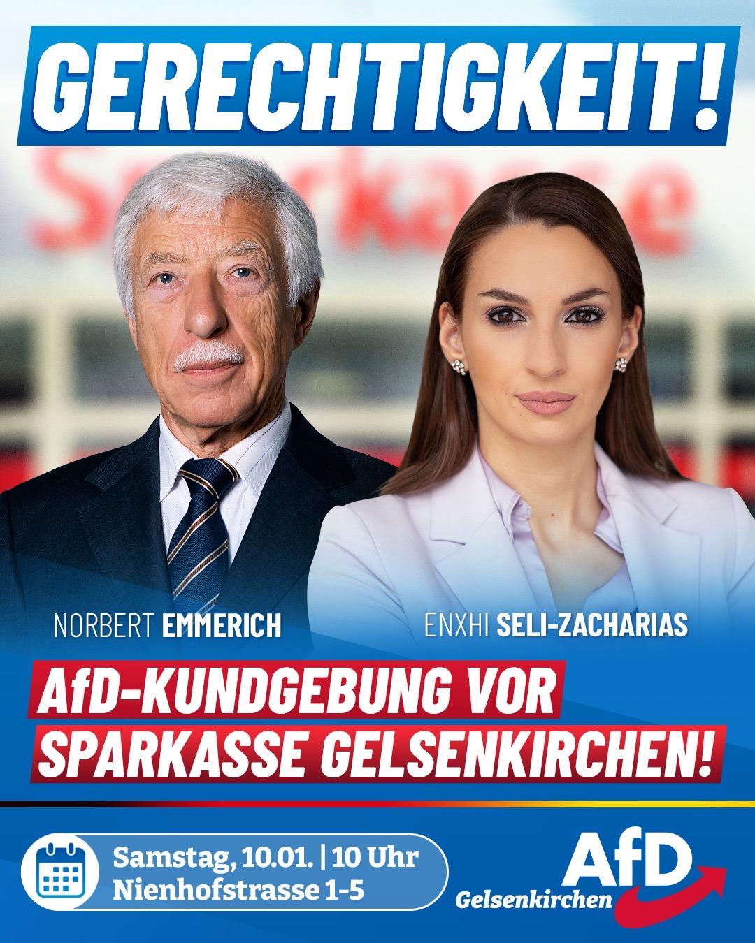 Liebe Freunde und Mitbürger, wir versammeln uns am Samstag, den 10. Januar 2026, um 10 Uhr vor der Sparkasse in Buer. Lassen Sie uns gemeinsam mit den Bürgern, den Betroffenen, für Gerechtigkeit einstehen! Dort werden wir gemeinsam mit Bundestags- und Landtagsabgeordneten der AfD mit Bürgern diskutieren und ihnen zur Seite stehen! Zeigen Sie Solidarität und schauen Sie bitte vorbei!